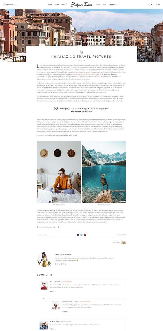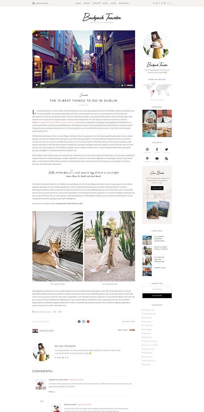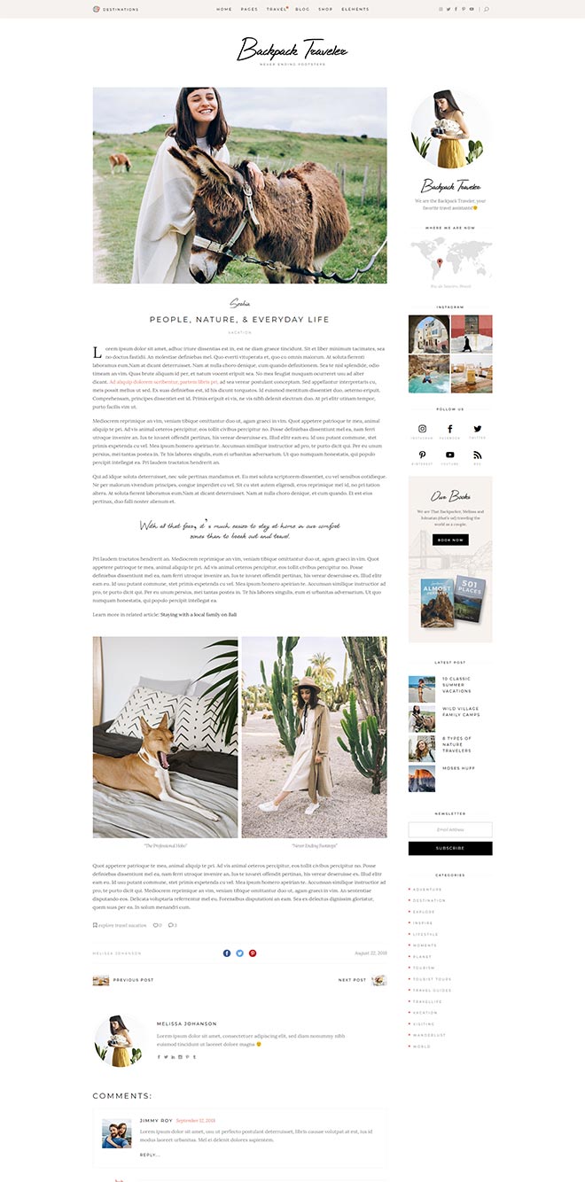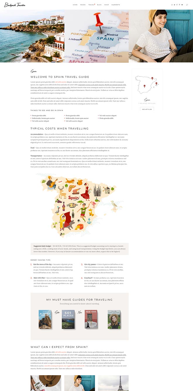 Practical Inner Pages Backpack Traveler comes with a stunning array of ready-to-use inner page, templates which are just amazing forletting everyone know about what you do & presenting yourself. You also get a destination map for highlighting all the places you visited or wrote about, as well as a contact form layout.